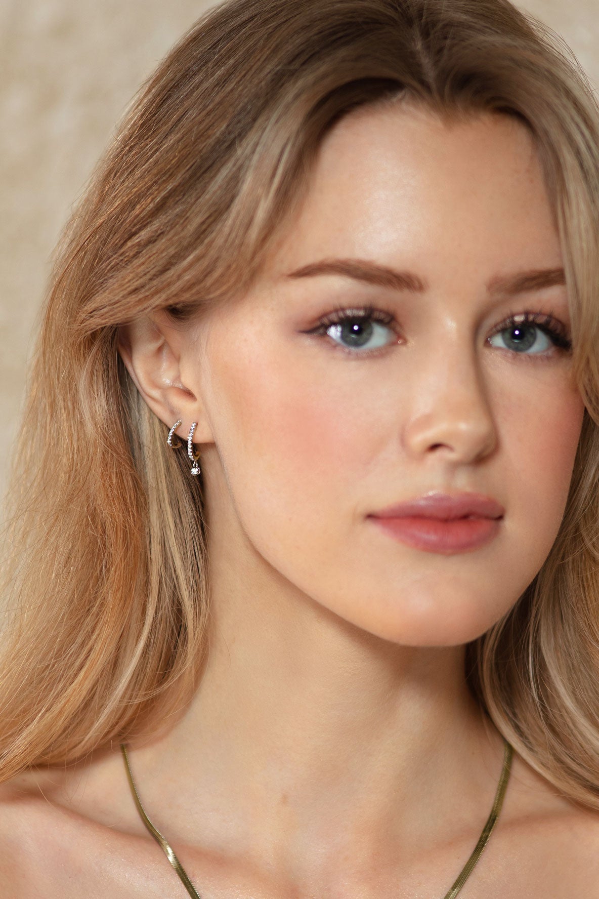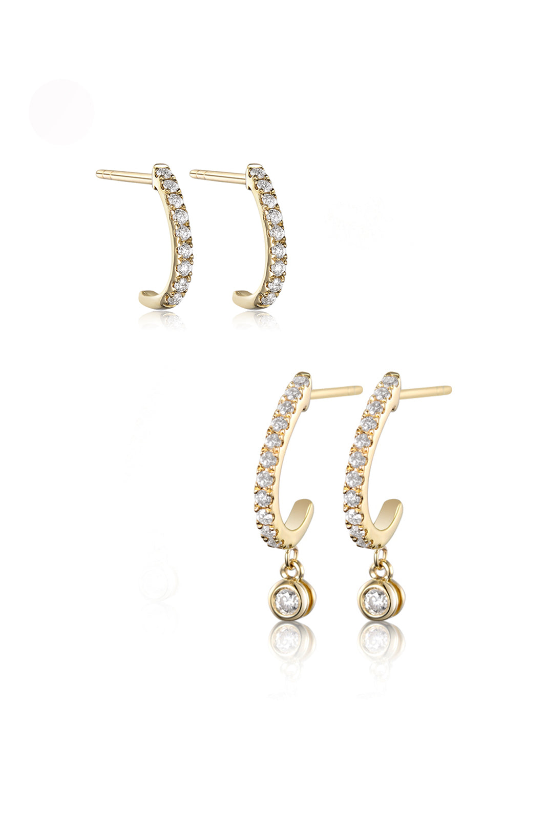 Pictured here: the Mini Hook Diamond Huggie (Pair) stacked with the Waverly Diamond Huggie (Pair), finished with a delicate dangling diamond.